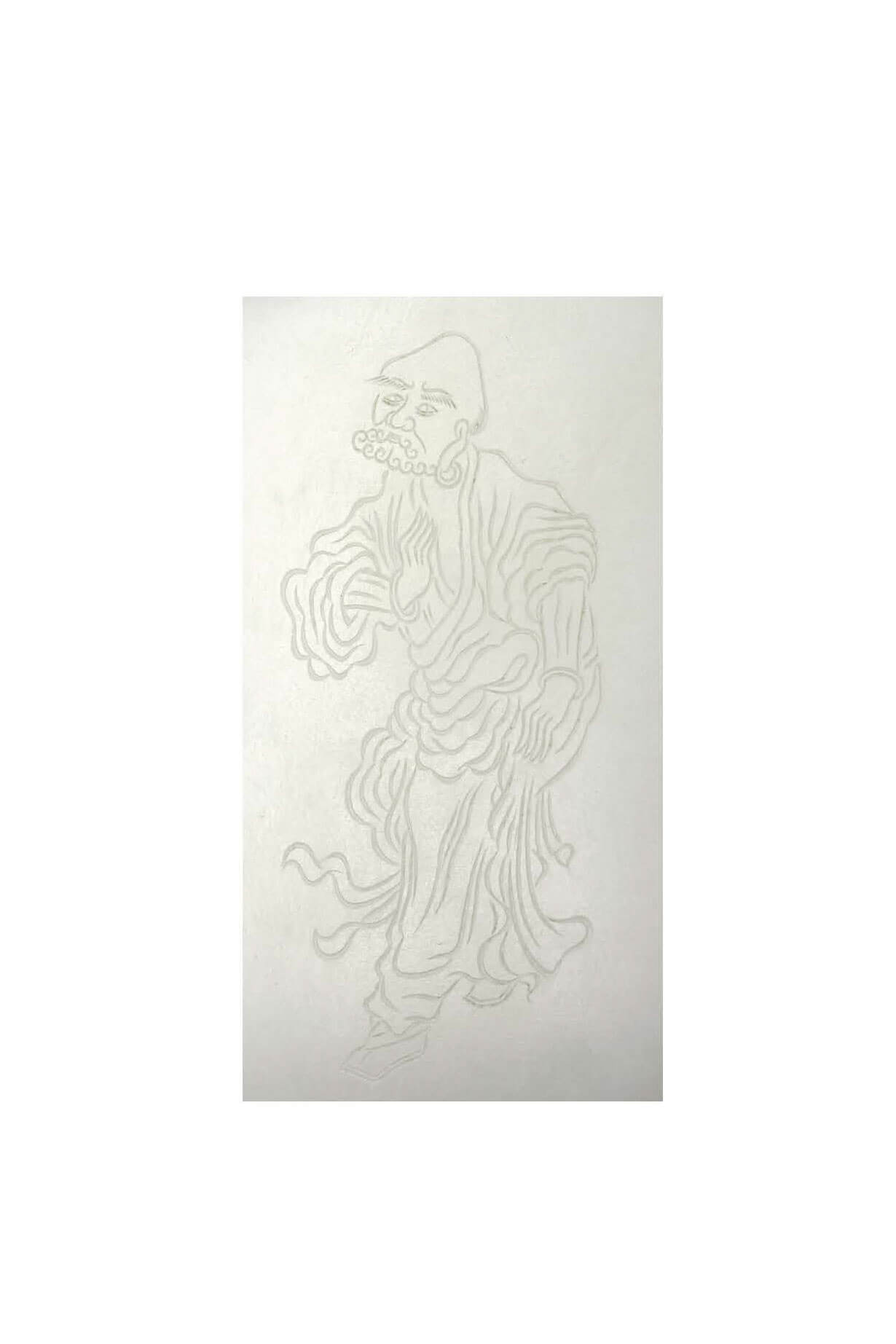 此器拋磨精細,然以砣具處理綫條,為商代一貫之玉雕手法。看此玉神人的髮絲,於此僅三指寬的器型上,真如指紋般細密。然放大局部細看,可見以砣具琢磨成的綫條,呈現中間寬深兩端尖細的特徵,並斷續連接成較長的綫條,為了讓綫質保持剛勁直捷的感受,不特意修飾綫條連接處。這種琢刻的特點,縱使在圓轉的綫條,亦可見製作手法留下的痕跡。其如鷹眼般的臣字大眼,震懾直逼人心,不但是造型誇大所致,亦是製作工法中刻意保留其銳利感。據研究,臣字形眼為商周玉器上常見之紋樣,然兩時代於紋飾與工法有所繼承,亦有所變革。以臣字眼而言,商代秉持其剛強作風,在製作過程中特別強調眼眶的綫條,故通常先以陰綫勾勒眼眶,再於眼眶內琢出圓形,此作法是為避免圓形的飽滿,減弱了平直綫條的表現力。這種看似直樸的手法,一般皆以為是商代玉器,工法未臻成熟,故無法駕馭綫條的流暢性,然實是商代玉器美感之所在。
