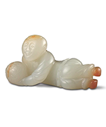 童雕玉飾是最純真,最惹人喜愛的玉雕主題。由嬰戲圖延伸而出的童雕,就像風俗人物畫一般,表現著人情之常,尤其是一生中最無憂無慮的童年往事。稚童或站,或立,或蹲,或臥,姿態自然,隨意耍玩,題材多樣,趣味橫生。童雕玉飾以一種往日情懷的眷戀,勾動著觀者天真無邪的童心。故器型比例與動作,往往有種誇飾的表現手法,更增喜感逗趣,俏皮可人的效果。而除了動作,童趣玉雕中不可或缺的,還有孩童不離手的各式童玩,或鼓或笛,或大可當傘的荷葉,或隨意撿折的草葉花枝。延伸為吉祥喜慶的象徵之後,又有泉幣、如意、鯉魚、公雞等等。孩童不但為家族延續命脈,更是一家和樂幸福的來源,是生命與希望的初始。中國傳統年畫中,祈求多子多孫,富貴延年,都以身著彩衣的垂髫孩兒,喻意家族未來的無限祈願。